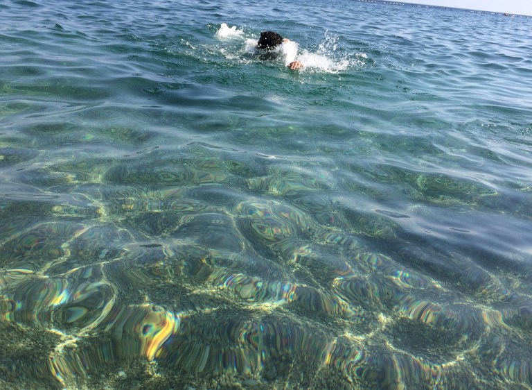 Sahile ulaştığımızda, daha önce hiç karşılaşmadığım eşsiz berraklıktaki tertemiz suyu görünce hayran kalıyorum hemen.