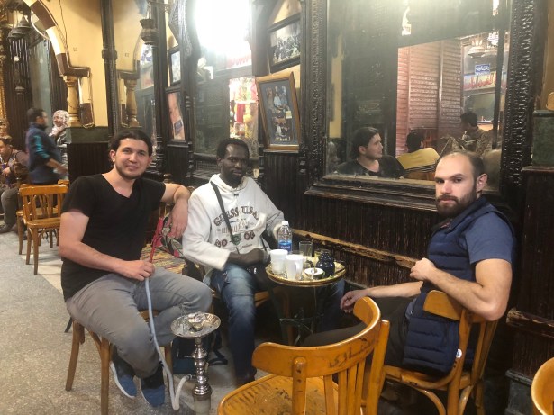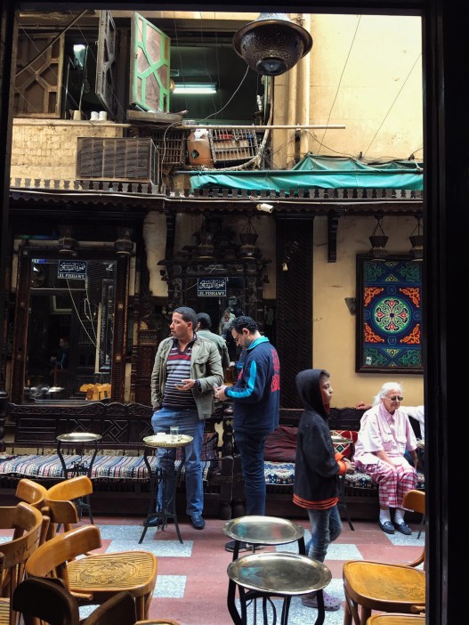 Bu kahvehane için Kahire’nin merkezi desek yanlış olmaz. Sokağın her iki yanına dizilen sandalyelere, sedirlere oturup etrafı seyretmeniz dahi Kahire’yi anlamanıza yeter aslında. Kahire’nin bütün renklerini üzerlerinde taşıyan insanlar önünüzden geçerler durmaksızın. Mekanın içi de bir o kadar ilgi çekicidir ve günün her vaktinde içeri girip çıkan satıcıların varlığı sizi hiç rahatsız etmez. Kimi elindeki anahtarlıklarla girer içeriye kimi sırtındaki halıyla, bir çocuk kucağında kitaplarla, bir teyze elindeki patiklerle.