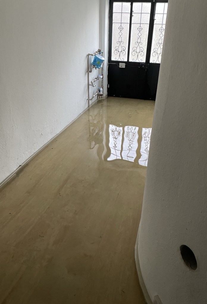 İşe gitmek üzere aşağıya indiğimizde ise, bizi giriş katına kadar ulaşan yağmur suları karşıladı. İşte bu gerçekten şok ediciydi 🙂 Su merdiven basamaklarına kadar yükselmişti.