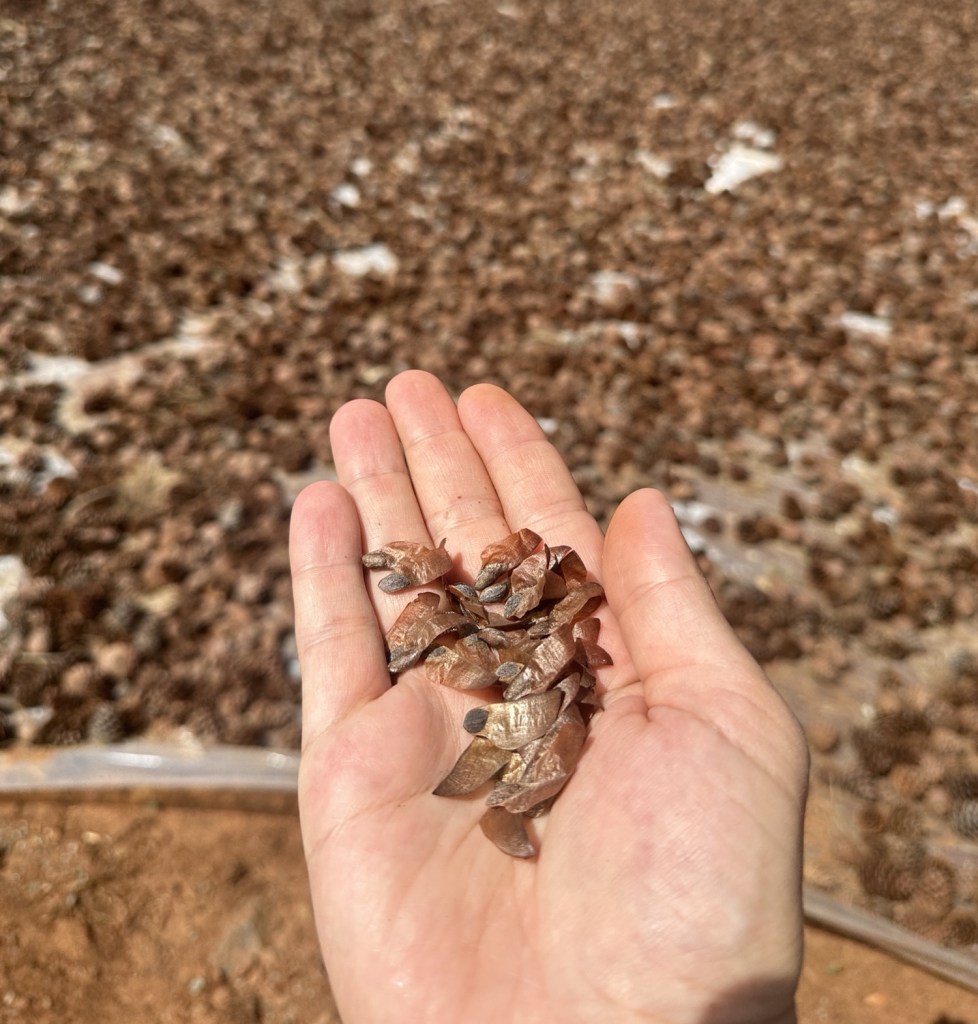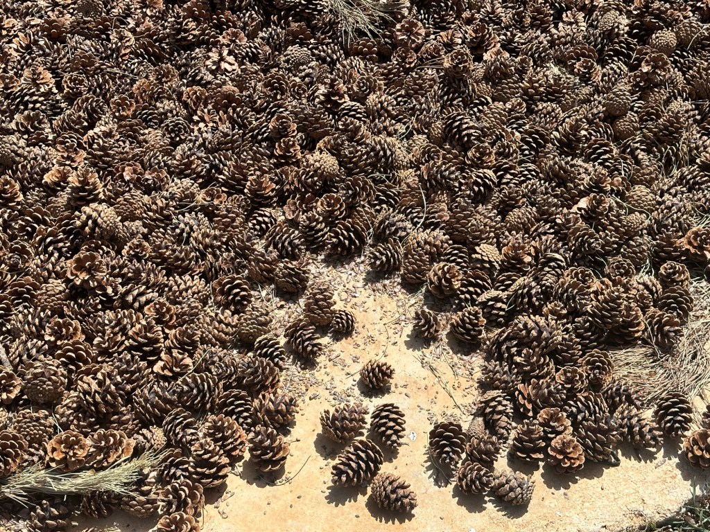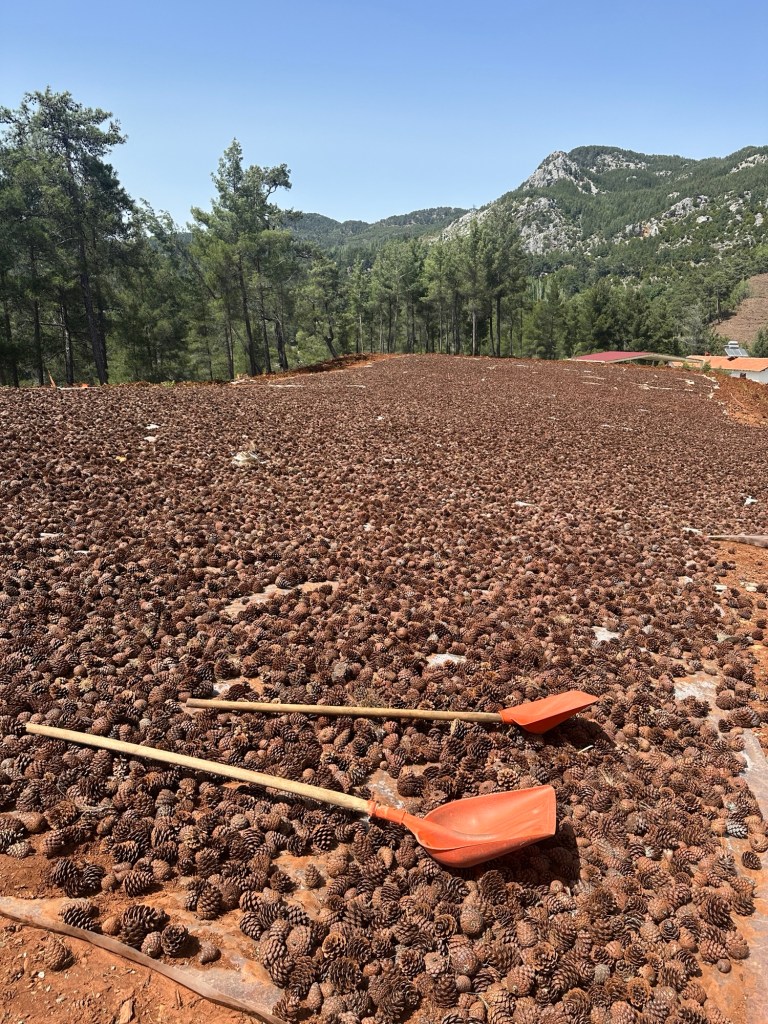 Kurumaya bırakılmış karaçam kozakları. Kozalaklardan elde edilen tohumlar, yangın sahalarında ve gençleştirme sahalarında kullanılmaktadır.